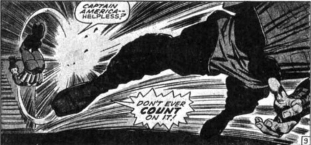 Näin Captain America ottaa räjähtävän lähikontaktin kohteeseen. Taistelupari kimpoaa iskussa eri suuntiin, mutta kapteenilla kimpoaminen huipentuu iloiseen kieppiin. Iloraivon juhlaa ! Tulkinta on Klaus Theweleitin.